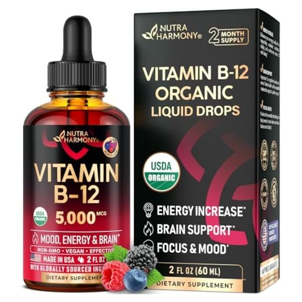 USDA Organic Vitamin B12 Sublingual Drops – 5000 mcg Liquid Vegan Methylcobalamin for Women & Men – Energy Boost, Focus & Mood, Brain Health Support – Maximize Absorption – 2 Month Supply, 2 fl oz